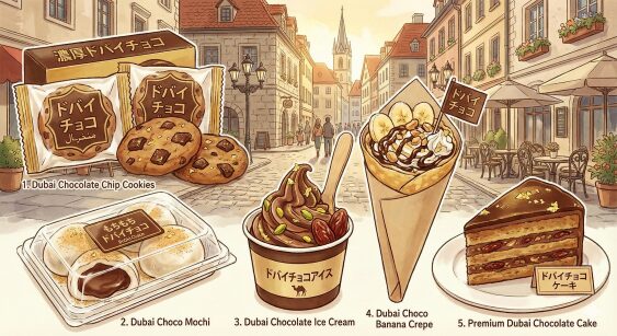『ドバイチョコ』の関連商品(クッキー、餅(もち)、アイス、クレープ、ケーキ)