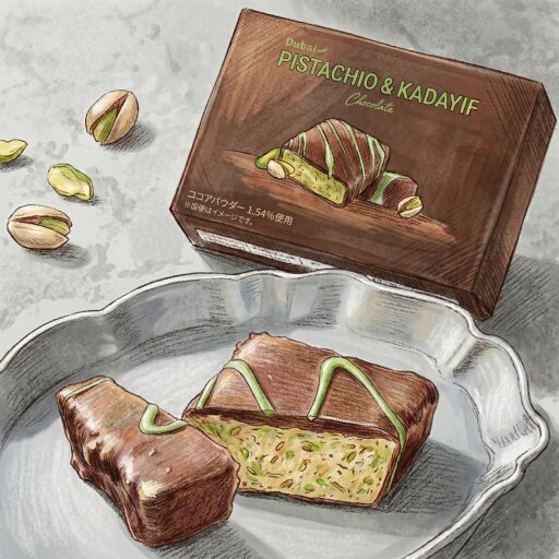 TikTokやInstagramのリール動画をスクロールしている最中に、一度はその衝撃的な映像を目にしたことがあるのではないでしょうか? 分厚いチョコレートを割ると、中から溢れ出す鮮やかなエメラルドグリーンのピスタチオクリーム。そして、そのクリームの中にぎっしりと詰め込まれた、謎の繊維状の物体。ひとたび口に入れれば、ASMR(聴覚への快感反応)動画として成立してしまうほどの、心地よい音色が響き渡ります。