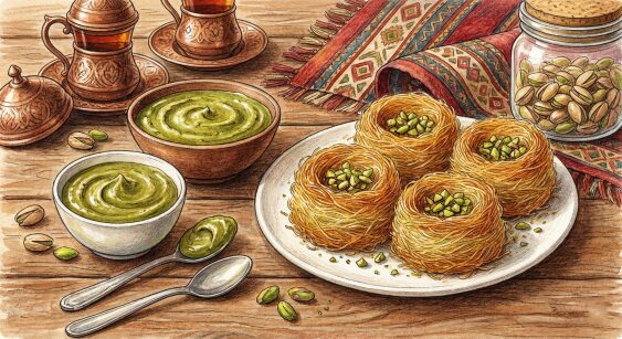 味の核となるのが、このピスタチオクリームです。「ナッツの女王」とも称されるピスタチオを贅沢に使用したペーストは、非常に高価な材料の一つです。安価な製品では着色料や香料で誤魔化されることもありますが、本格的なドバイチョコレートでは、ピスタチオ本来の芳醇な香り、まろやかな油脂分、そして奥深いコクが感じられます。このクリームが、乾燥した麺であるカダイフを包み込み、口の中で一体感を生み出す接着剤の役割も果たしています。3 - カダイフ(Kadaif/Kataifi):