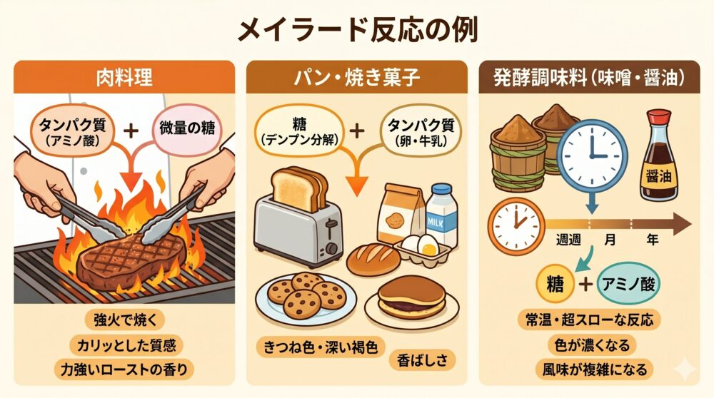 そして、日本人の食卓に欠かせない「味噌や醤油」などの発酵調味料も、実はメイラード反応の賜物です。これらは火を通しているわけではありませんが、数ヶ月から数年という長い年月をかけて、常温でじっくりと糖とアミノ酸が結合し続けています。お味噌が熟成とともに色が濃くなり、風味が複雑になっていくのは、この「超スローなメイラード反応」のおかげなのですね。