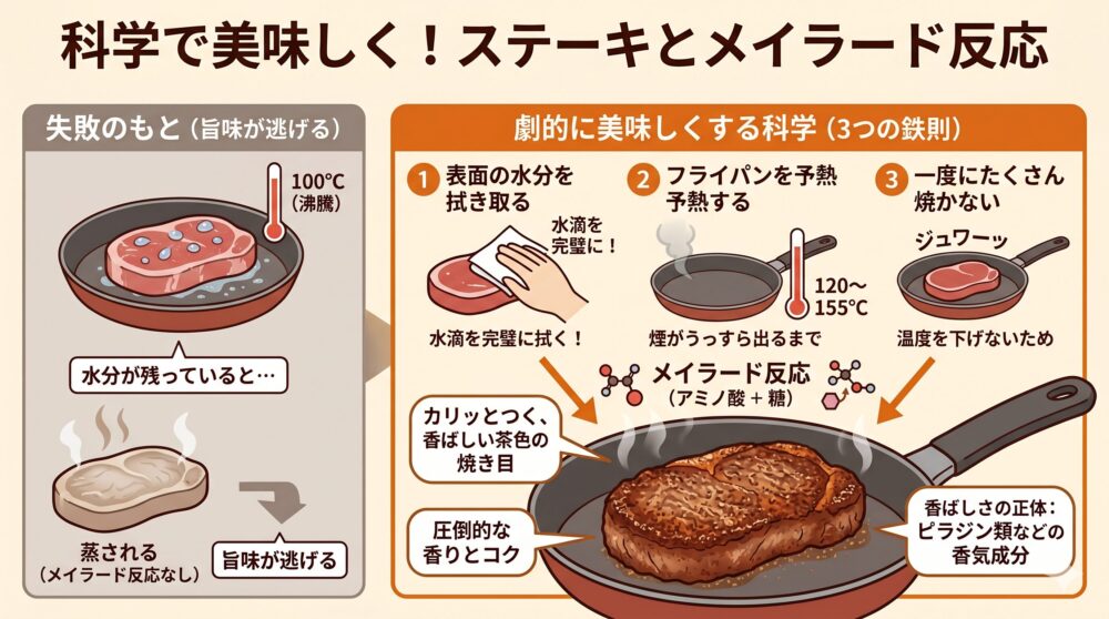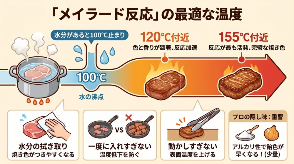 答えは、水の沸点にあります。水が存在する環境下では、加熱しても温度は100℃(沸点)以上に上がりません。すべての水分が蒸発して、初めて表面温度が120℃、さらにはメイラード反応が最も活発になる「155℃付近」に到達できるのです。