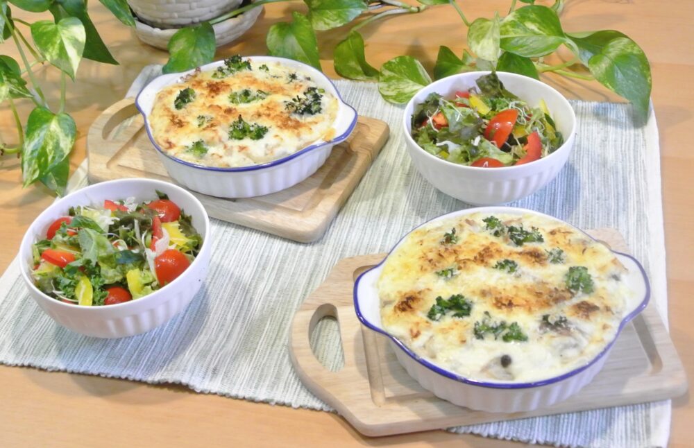 オーブンで焼いた際に表面のチーズやホワイトソース、パン粉が、メイラード反応によって美味しそうな焼き色がつき、香ばしい風味と旨味を生み出します。