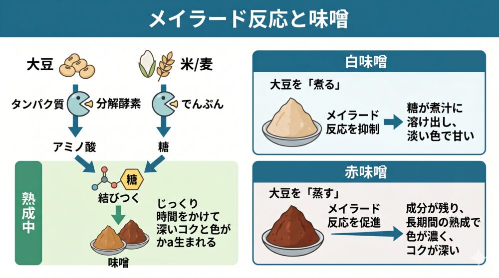 | 白味噌 | 大豆を「煮る」 | 抑制 | 糖が煮汁に溶け出すため色が淡く、甘みが際立つ |