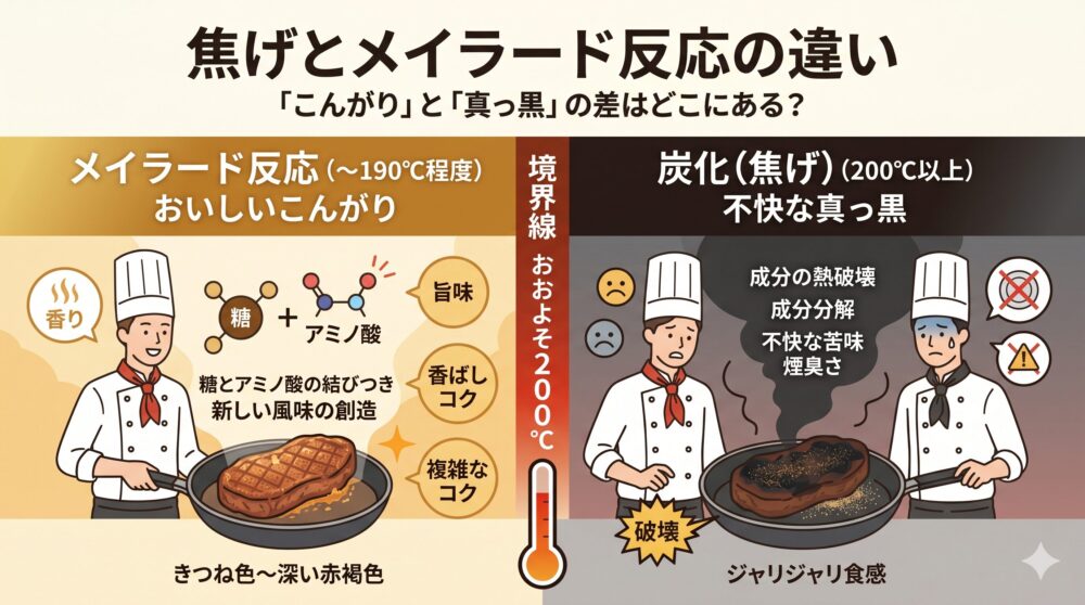 多くの人が、メイラード反応による褐色を「焦げ」と呼びますが、料理学の観点からは明確な境界線があります。メイラード反応は、糖とアミノ酸が複雑に結びついて「新しい風味」を創造するプロセスです。対して、本当の意味での「焦げ(炭化)」は、食材の成分そのものが熱によって破壊され、炭へと変化してしまうプロセスです。