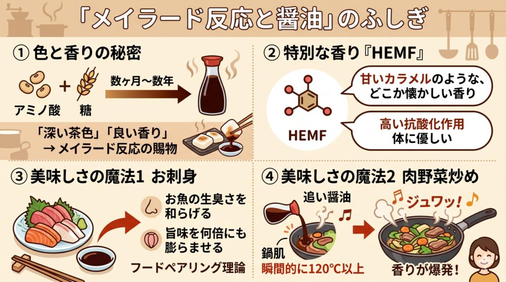 お刺身にお醤油をつけるとき、単に「塩味」を足しているだけではないと感じたことはありませんか? 実は、お醤油に含まれるメイラード反応由来の香気成分が、お魚の生臭さを和らげ、旨味を何倍にも膨らませてくれているのです。これを科学的には「フードペアリング理論」と呼び、共通の香気成分を持つもの同士が引き立て合う効果を利用しています。