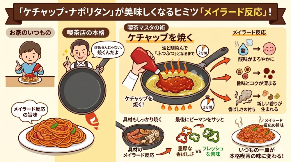 次は雰囲気を変えて、洋食の定番「ナポリタン」のお話です。喫茶店で食べるナポリタンって、なぜかお家で作るものより美味しく感じませんか? その秘密も、実はメイラード反応にあるのです。
