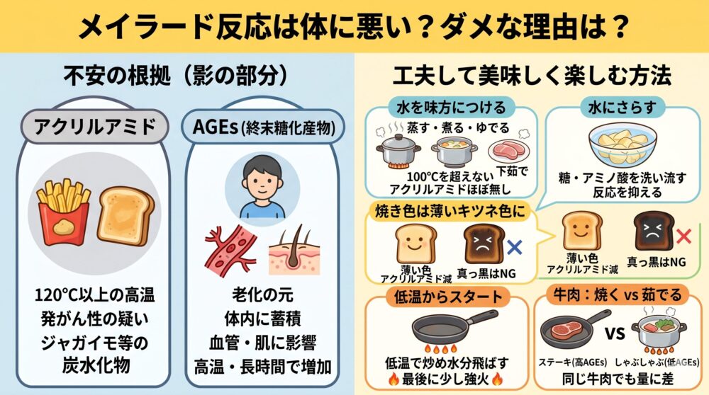 ここまでメイラード反応のポジティブな面を強調してきましたが、ここで少しだけ、私たちが知っておかなければならない「影」の部分についてもお話しします。