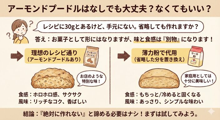 アーモンドプードルは、単なる香り付けではなく、生地の「骨格」の一部を担っています。もし30gのアーモンドプードルを単純に抜いてしまうと、粉の総量が減り、生地のバランスが崩れてしまいます。そのため、省略する場合はその分を薄力粉に置き換える必要があります。