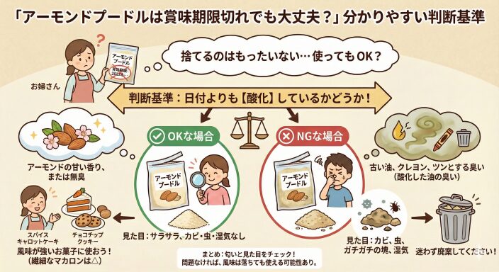 賞味期限はあくまで「美味しく食べられる期間」の目安です。しかし、アーモンドプードルの場合、保存状態によっては期限内でも劣化していることがありますし、逆に冷凍していれば期限を過ぎても使えることがあります。