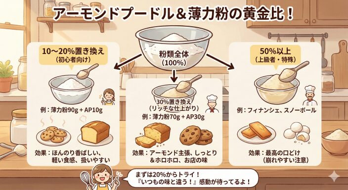 一般的に、パウンドケーキやクッキーなどの基本生地において、粉類全体(薄力粉+アーモンドプードル)のうち、10%〜30%をアーモンドプードルに置き換えるのがセオリーです。
