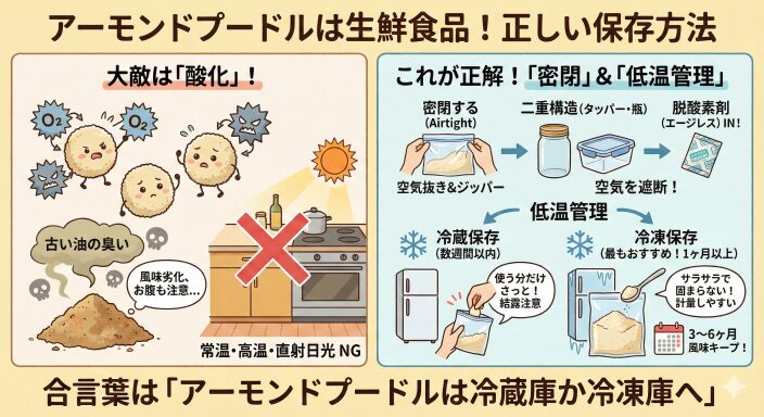 アーモンドプードルを扱う上で、最も注意しなければならないのが「保存」です。「粉だから常温でずっと置いておいても大丈夫」と思っていませんか?実はそれは大きな間違いです。アーモンドプードルは、非常にデリケートな生鮮食品に近いと考えていただいた方が良いでしょう。