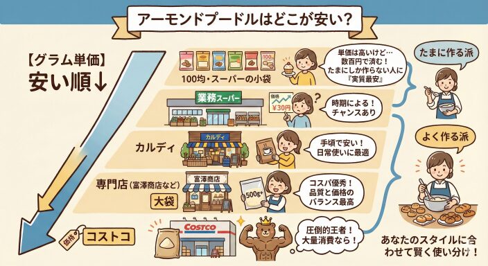 | 業務スーパー | アーモンドプードル (500g) | ストックしておきたい人 | 店舗により価格変動大。品質確認推奨。 |
