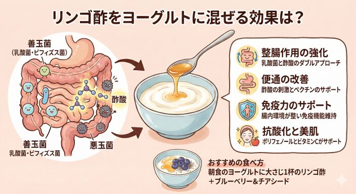 ヨーグルトの最大の魅力は、生きた乳酸菌やビフィズス菌が腸内に届き、善玉菌の働きを助けることです。ここにリンゴ酢の主成分である「酢酸」が加わると、腸内はより善玉菌が活躍しやすい環境へと整えられます。酢酸には悪玉菌の増殖を抑える力があり、腸内の腐敗を防ぐサポートをしてくれるからです。