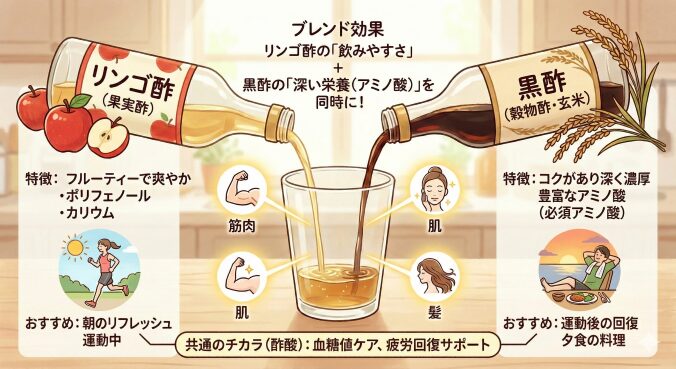 これらをブレンドして飲むことで、リンゴ酢の「飲みやすさ」と、黒酢の「深い栄養(アミノ酸)」を同時に手にすることができます 。アミノ酸は私たちの筋肉や肌、髪を作る大切な材料であり、特に体内で合成できない必須アミノ酸を食事から摂ることは、年齢を重ねるごとに重要性を増していきます 。