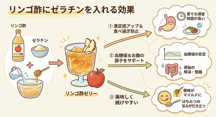 リンゴ酢の成分とゼラチンの水分保持能力が、お腹の調子を整えるのに役立ちます。 - 簡単で続けやすいレシピ