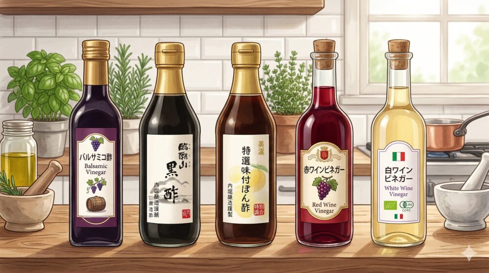「バルサミコ酢を使いたいけれど、ちょうど切らしてしまっている」「あのお酢と何が違うのかしら?」キッチンでお料理をしていると、そんな小さな迷いが生まれることがありますよね。お酢の世界は、まるでお花畑のように、それぞれが異なる香りと個性を放っています。他のお酢との違いを深く知ることは、単なる知識としてだけでなく、皆さんのお料理のインスピレーションを広げる素敵な鍵になります。