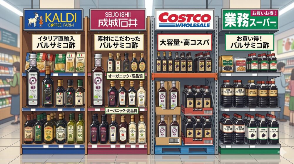 いざ「バルサミコ酢を使ってみよう!」と思ったとき、どこに行けば自分にぴったりの一本に出会えるのでしょうか。最近では身近なショップで、個性豊かなバルサミコ酢が手に入るようになっています。皆さんのライフスタイルに合わせて、どこで何を買うべきか、詳しくガイドしますね。