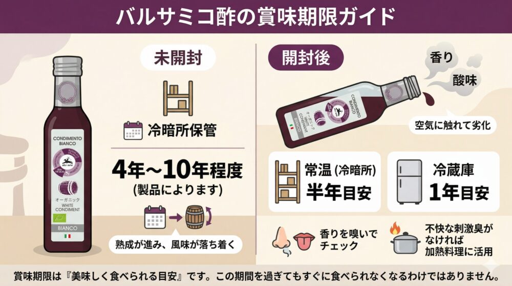 未開封であれば、バルサミコ酢は驚くほど長持ちします。熟成期間そのものが12年や25年という商品があることからも分かる通り、お酢は時間の経過とともに風味が落ち着いていく傾向があります。しかし、家庭で開封した後は空気に触れるため、少しずつ香りが弱まったり、酸味が尖ってきたりすることがあります。ですから、半年から1年を目安に、美味しい記憶が新しいうちにどんどん活用してあげてくださいね。