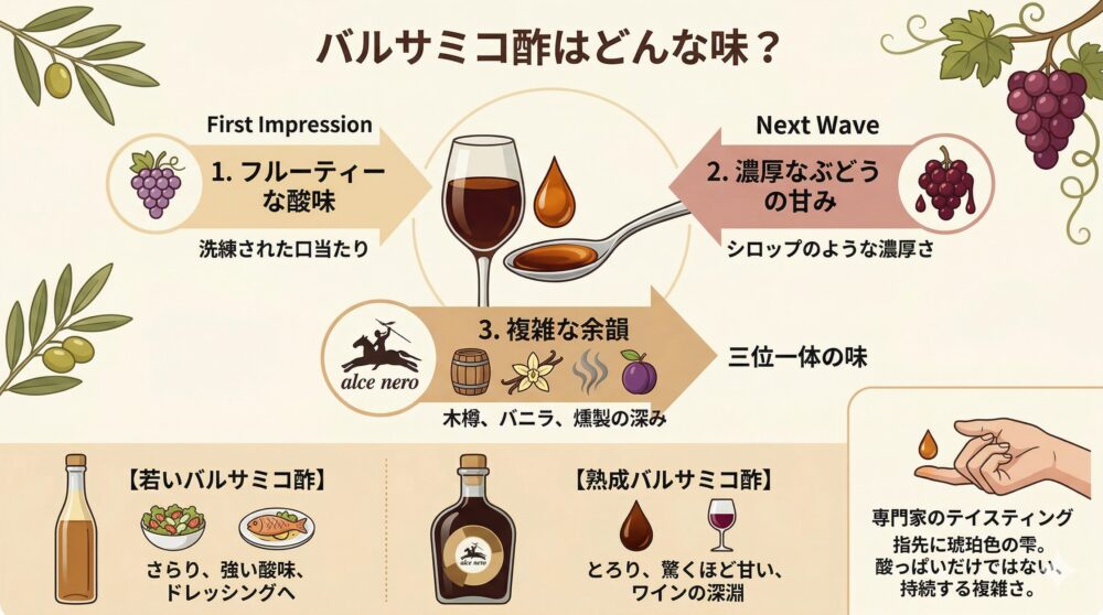 気になるそのお味ですが、バルサミコ酢を一言で表現するなら「甘みと酸味、そして深淵なコクの三位一体」です。口に含んだ瞬間、まず洗練されたフルーティーな酸味が広がり、その後に追いかけてくるのが、シロップのように濃厚なぶどうの甘み。そして、最後に喉の奥に漂うのが、木樽から移ったバニラや燻製、プラムを思わせる複雑な余韻です。