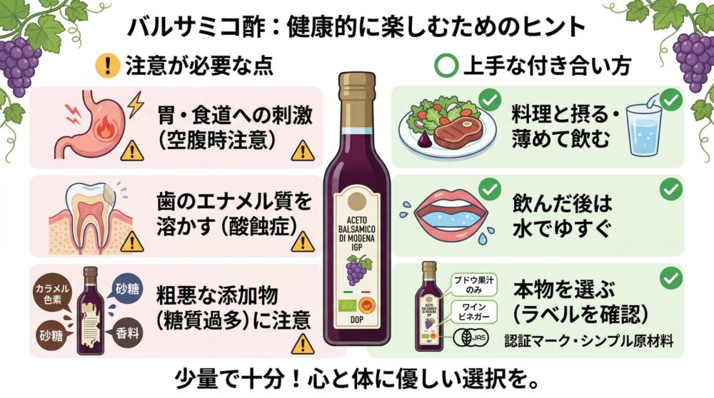 バルサミコ酢は、古くから人々の健康を支えてきた素晴らしい食品ですが、そのパワフルな性質ゆえに、少しだけ注意が必要な側面もあります。皆さんがずっと安心してバルサミコ酢と仲良くお付き合いいただくために、覚えておいていただきたいポイントがいくつかあります。