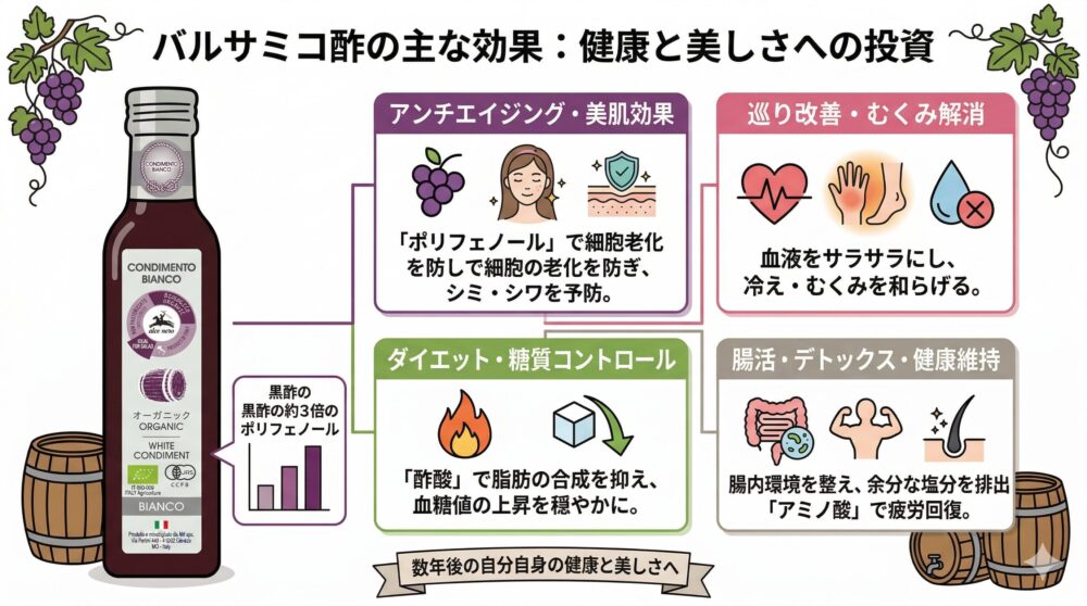バルサミコ酢を手に取るとき、その深い琥珀色や独特の香りに期待が膨らむ一方で、「実際にはどんな健康効果があるの?」「酸っぱいものは胃に負担がかからないかしら?」といった細かな疑問が浮かぶこともあると思います。また、「使い方が難しそう」と、キッチンの奥に眠らせてしまっている方もいらっしゃるかもしれません。日々の暮らしに安心して、そして楽しくバルサミコ酢を取り入れられるよう、まずはその機能性と注意点を、科学的根拠と知恵の両面から紐解いていきますね。