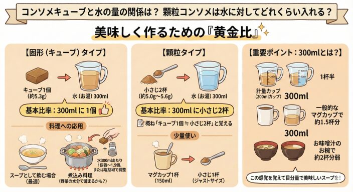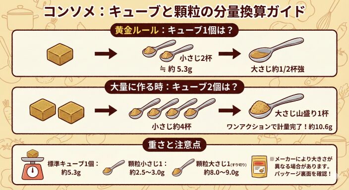 - 注意点: 顆粒の比重は商品によって異なりますが、概ね「キューブ1個 ≒ 小さじ2杯」と覚えておけば大きな失敗はありません。