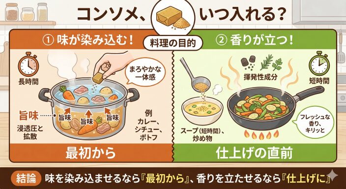 コンソメを入れるタイミングは、「料理の目的(味の浸透 vs 香りの維持)」によって正解が異なります。料理科学の視点から使い分けることで、仕上がりに大きな差が出ます。