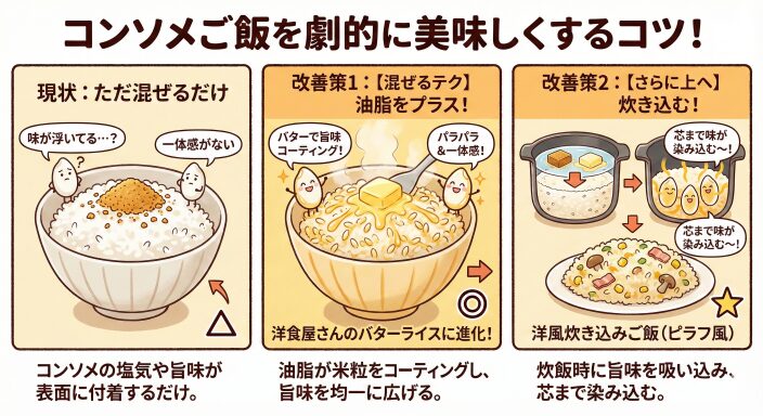 温かいご飯にコンソメ顆粒を混ぜる際、必ずバター(またはオリーブオイル)をひとかけら加えてください。 - 理由: