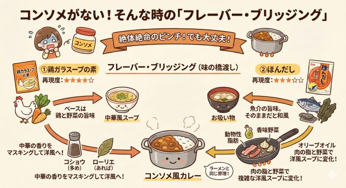そんな絶体絶命のピンチでも、諦める必要はありません。日本の家庭にある一般的な調味料を組み合わせることで、コンソメに近い味を「合成」することができます。これを「フレーバー・ブリッジング(味の橋渡し)」と呼びます。