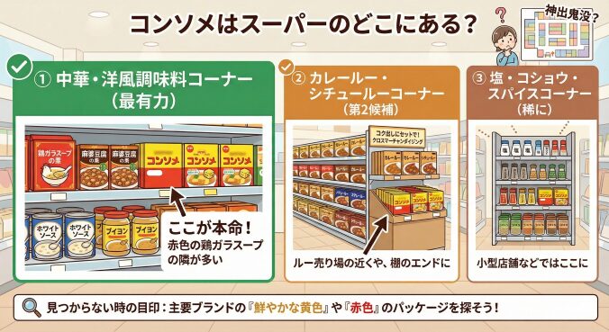広いスーパーマーケットの中で、コンソメが見つからずに売り場を彷徨ってしまったことはありませんか? コンソメは、店舗のレイアウト戦略によって配置される場所が異なる「神出鬼没」なアイテムですが、探すべき場所には法則があります。
