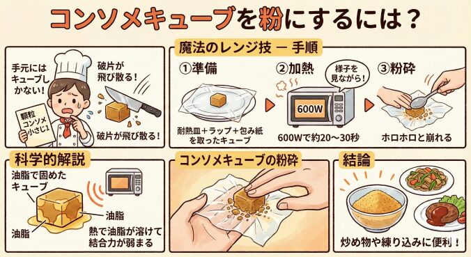 コンソメキューブは、粉末原料を牛脂やパーム油などの「油脂」をつなぎとして高圧でプレスして固めています。電子レンジのマイクロ波は、キューブ内の微量な水分や油脂分子を振動させ、熱を発生させます。この熱によって、つなぎの役割をしていた油脂が溶け始め(融点を超え)、結合力が弱まります。その結果、少しの力を加えるだけで元の粉末状態に戻るのです。