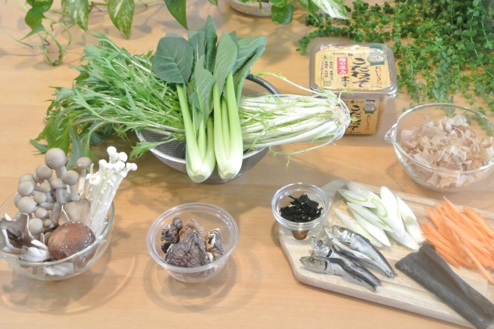 材料は、水菜、小松菜、干し椎茸、いろんなキノコ類、ネギ、人参、乾燥ワカメ、出汁(鰹節、干し昆布、煮干し)です。