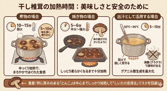 干し椎茸は、戻した後の適切な加熱が美味しさと安全性の両面で重要です。旨みを定着させ、食感を最高のものにするための加熱時間の目安は以下の通りです。