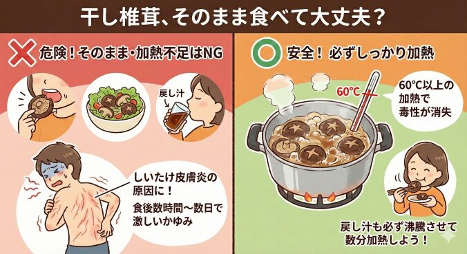 不十分な加熱は、後述する「しいたけ皮膚炎」のリスクを伴うため、特に厚みのある「どんこ」を調理する際は、中心部までしっかりと熱が通っているか確認することが大切です 。