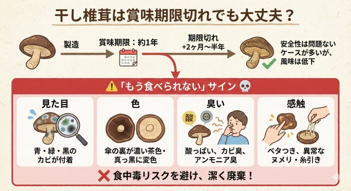 これらの兆候がある場合は、食中毒のリスクを避け、潔く廃棄してください。自家製の干し椎茸の場合は、乾燥が市販品ほど完璧でないことが多いため、密閉容器に乾燥剤を入れて保管し、2〜3ヶ月を目安に食べきるのが安心です 。