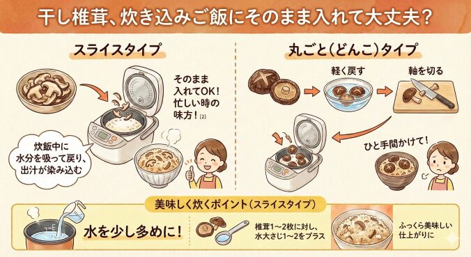 • 炊く際のポイントは、通常よりも少しだけ(椎茸が吸う分の水分を)多めにすることです。椎茸1〜2枚に対して大さじ1〜2程度の水をプラスすると、ふっくらとした美味しい炊き込みご飯に仕上がります 。