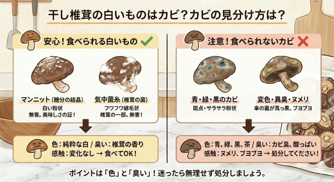 見分けるポイントは「色」と「臭い」です。本物のカビは、青、緑、黒といった色を持っており、鼻を突くような不快なカビ臭がします 。真っ白で、かつ椎茸特有の良い香りが維持されているのであれば、それは「美味しさの証」と思って安心してください。