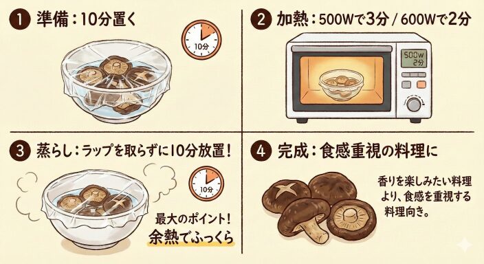 もっともスピーディーに干し椎茸を戻したい場合、電子レンジの力を借りる方法があります。ただし、単に加熱するのではなく、前後の「蒸らし」が重要です。