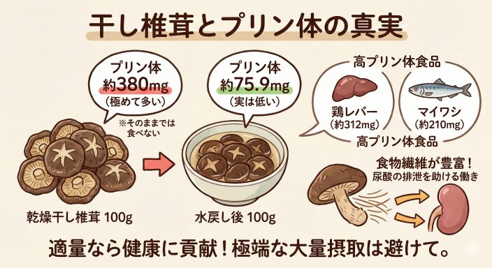 • しかし、私たちは干し椎茸を乾燥したまま100g食べることはありません。水で5倍に戻した状態では、100gあたりのプリン体含有量は約75.9mgまで低下します。これは、鶏レバー(312mg)やマイワシ(210mg)などの高プリン体食品と比較すると、実は低い数値です。