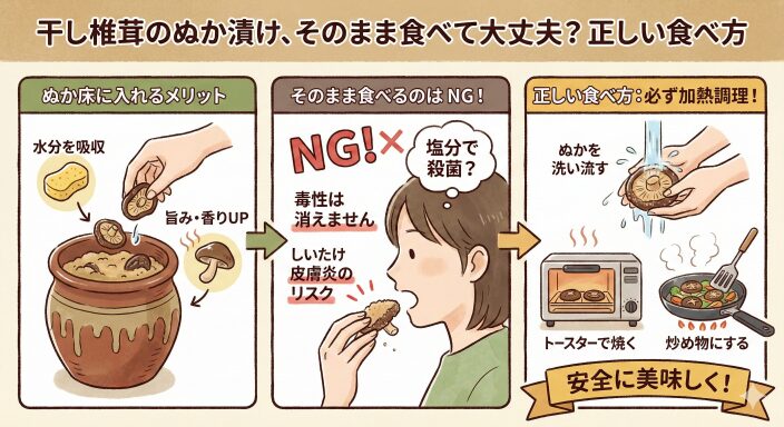 安全に美味しくいただくためには、ぬか床から取り出した椎茸は、表面のぬかを洗い流した後、トースターで焼く、あるいは細かく切って炒め物にするなど、必ず加熱調理をしてからその風味を楽しんでください。