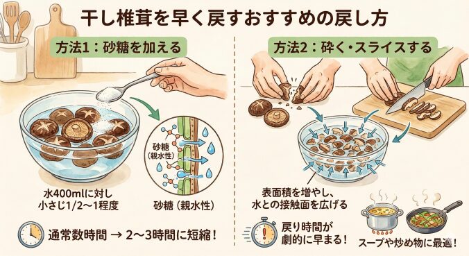 • 一つ目の方法は、戻し水に少量の砂糖(水400mlに対し小さじ半分から1程度)を加えることです。砂糖には親水性があり、椎茸の細胞壁の網目構造を緩める働きがあるため、真水よりも素早く水分を内部に送り込むことができます。これにより、通常なら数時間かかる戻し時間を、2〜3時間程度まで短縮することが可能です。