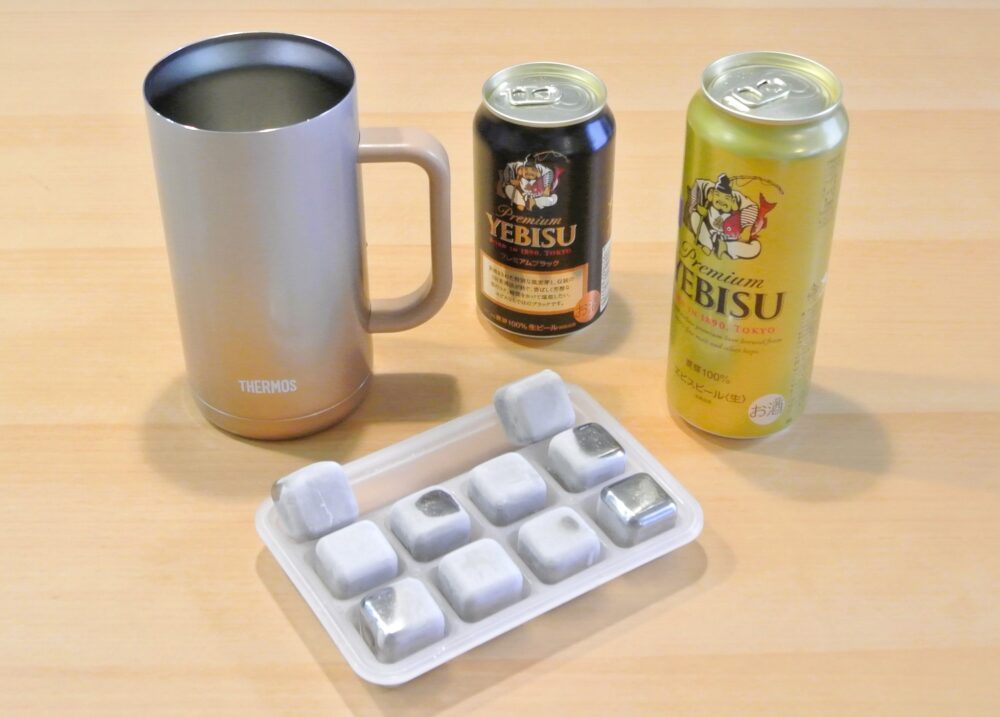 ひみりか家では500mlの缶ビールを飲むときに、720mlの真空断熱タンブラーと4個のステンレス氷を組合わせています。