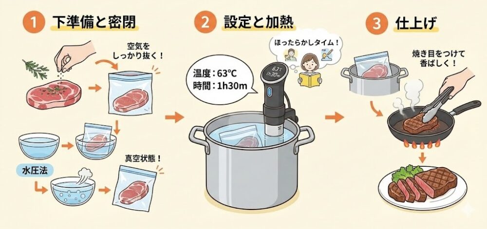 大きめの鍋やコンテナに水を張り、低温調理器をセットします。レシピに応じた温度(例:63℃)と時間(例:1時間30分)を設定し、予熱スタート。設定温度になったら、準備した食材を袋ごとお湯に入れます。あとはタイマーが鳴るまで、読書をするもよし、他の家事をするもよし、自由な時間です5。 - 仕上げ