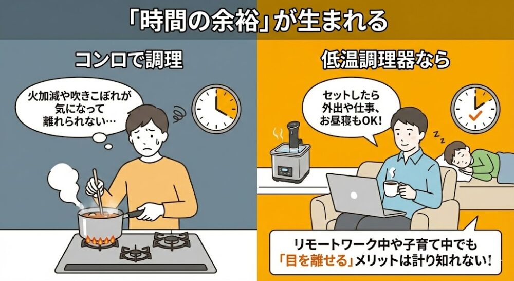 コンロで調理する場合、火加減を見たり吹きこぼれを気にしたりと、キッチンの前から離れられませんよね。低温調理なら、セットさえすれば外出しても、お昼寝をしていても大丈夫。リモートワーク中のランチ作りや、子育て中の食事準備においても、この「目を離せる」メリットは計り知れません。