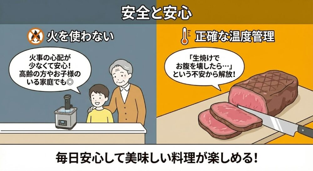 火を使わないので、高齢の方やお子様のいる家庭でも火事の心配が少なく安心です。また、温度管理が正確なので、「生焼けでお腹を壊したらどうしよう…」という不安からも解放されます。