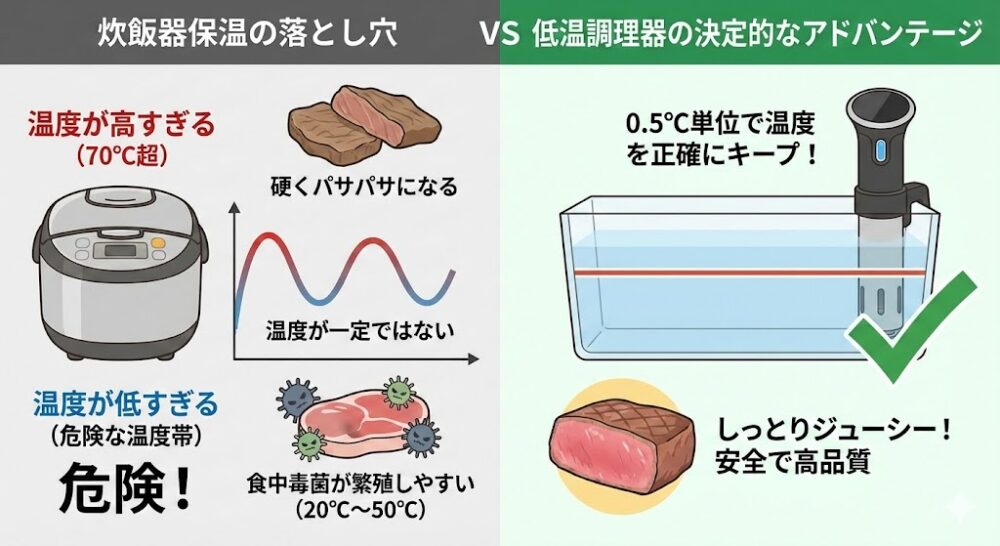「炊飯器の保温モードや電気圧力鍋でもできるんじゃない?」という疑問もよく耳にします。確かに似たようなことは可能ですが、「安全性」と「仕上がりの質」において、低温調理器には決定的なアドバンテージがあります。