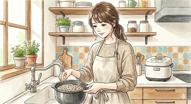 ここで雑穀を投入します。基本の割合は、白米1合につき、雑穀大さじ1〜2杯(約15g〜30g)です。- ポイント: 市販の雑穀ミックスの多くは「無洗」タイプですが、商品裏面を確認し、洗う必要がある場合は茶こしなどを使ってさっと洗ってください。