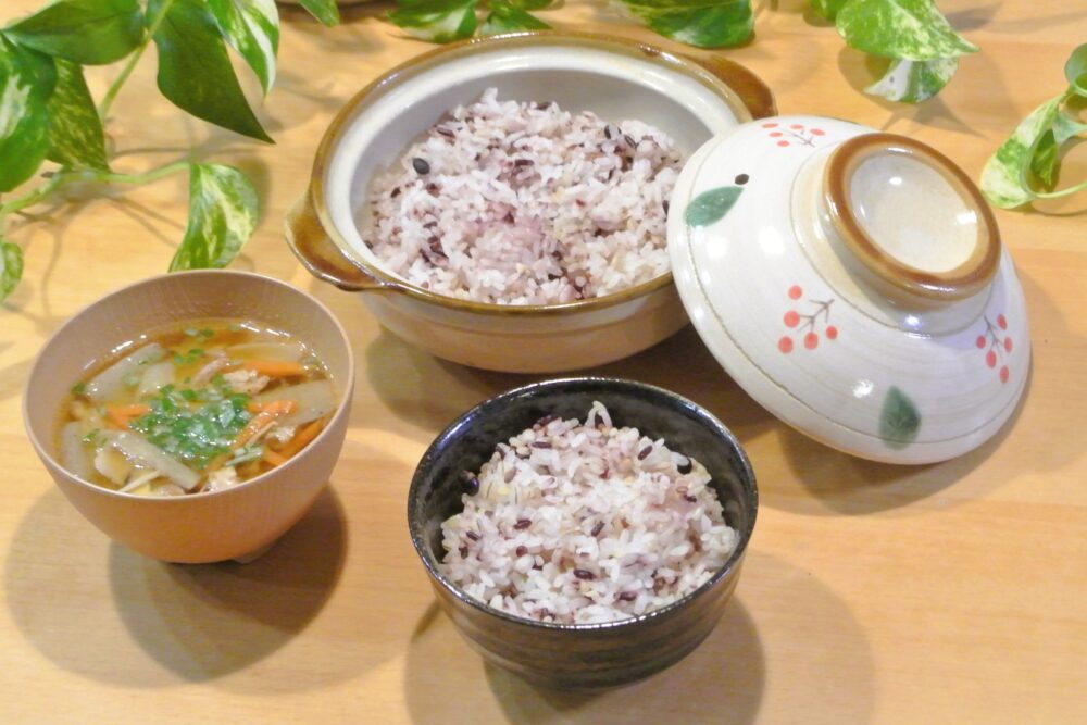 雑穀は白米よりも皮が硬く、中心まで吸水するのに時間がかかります。美味しく炊き上げるためには、夏場は30分、冬場は1時間以上しっかり浸水させてください。この時間が、穀物の芯を残さず、ふっくらモチモチに仕上げる鍵となります。また、玄米や雑穀に含まれる「フィチン酸(ミネラルの吸収を阻害する成分)」を低減させるためにも、浸水は有効です。 - 炊飯&蒸らし: