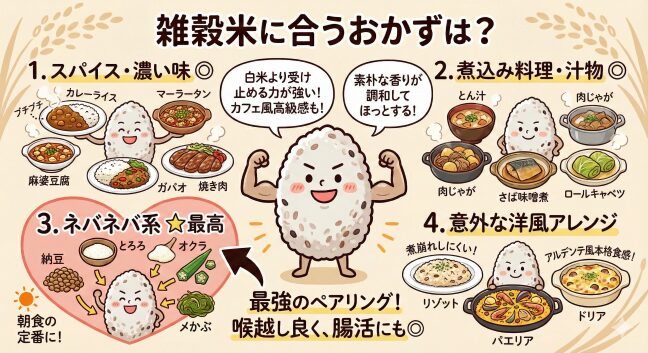 「雑穀米は和食にしか合わない」と思っていませんか? 実は、雑穀米は白米以上に「受け止める力」が強く、濃い味付けのおかずから、素材を生かした料理まで幅広くマッチします。