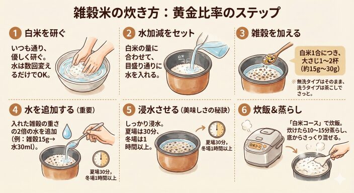 雑穀が入った分、水を足す必要があります。目安は「入れた雑穀の重さの2倍(同体積)の水」です。- 例: 雑穀大さじ1(15g)を入れたら、水は大さじ2(30ml)追加します。大麦など吸水率の高い穀物が多い場合は、少し多めにしても良いでしょう。